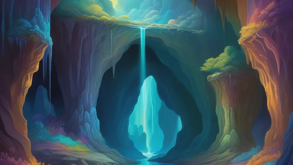 Caves represent the unconscious mind and hidden aspects of the self. They symbolize mystery, introspection, and the journey inward to discover deeper truths. Caves can also represent safety, refuge, or the womb-like return to origins.